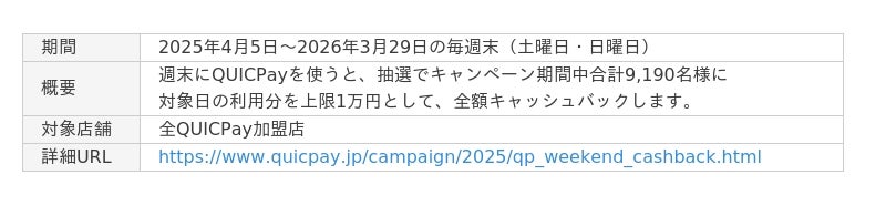 株式会社ジェーシービー (本社:東京都港区、代表取締役兼執行役員社長:二重 孝好、以下:JCB)は、2025年4月5日(土)から2026年3月29日(日)までQUICPay(クイックペイ)TM利用者を対象とした「週末は全額キャッシュバック!QUICPayチャンス!」キャンペーンを実施します。