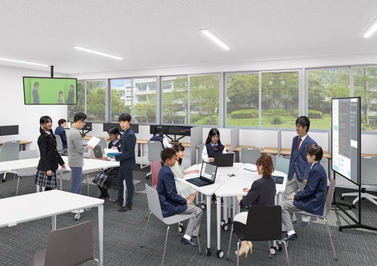 校舎建て替え期間中に使用する仮設校舎(青山キャンパス、西原キャンパス)では、新校舎に先駆けて最先端のICT環境と学習空間を整備し、『未来の学校』を先取りした学びがスタートします。
