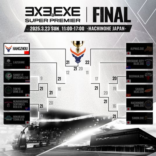 3人制バスケットボールのグローバルプロリーグ「3x3.EXE PREMIER(スリー・エックス・スリー・エグゼ・プレミア)」を運営するゼビオグループのクロススポーツマーケティング株式会社(代表取締役社長:中村考昭)が主催する、世界最高峰の国際リーグ『3x3.EXE SUPER PREMIER 2025 FINAL』が、本日3月23日(日)に青森県八戸市の「FLAT HACHINOHE」会場にて行われました。今大会では、昨年優勝を果たしたスイスのLAUSANNEを準決勝で破り、決勝でもALPHAS.EXEを破った、中国のHANGZHOU(ハンチョウ)が優勝を果たしましたため、お知らせいたします。