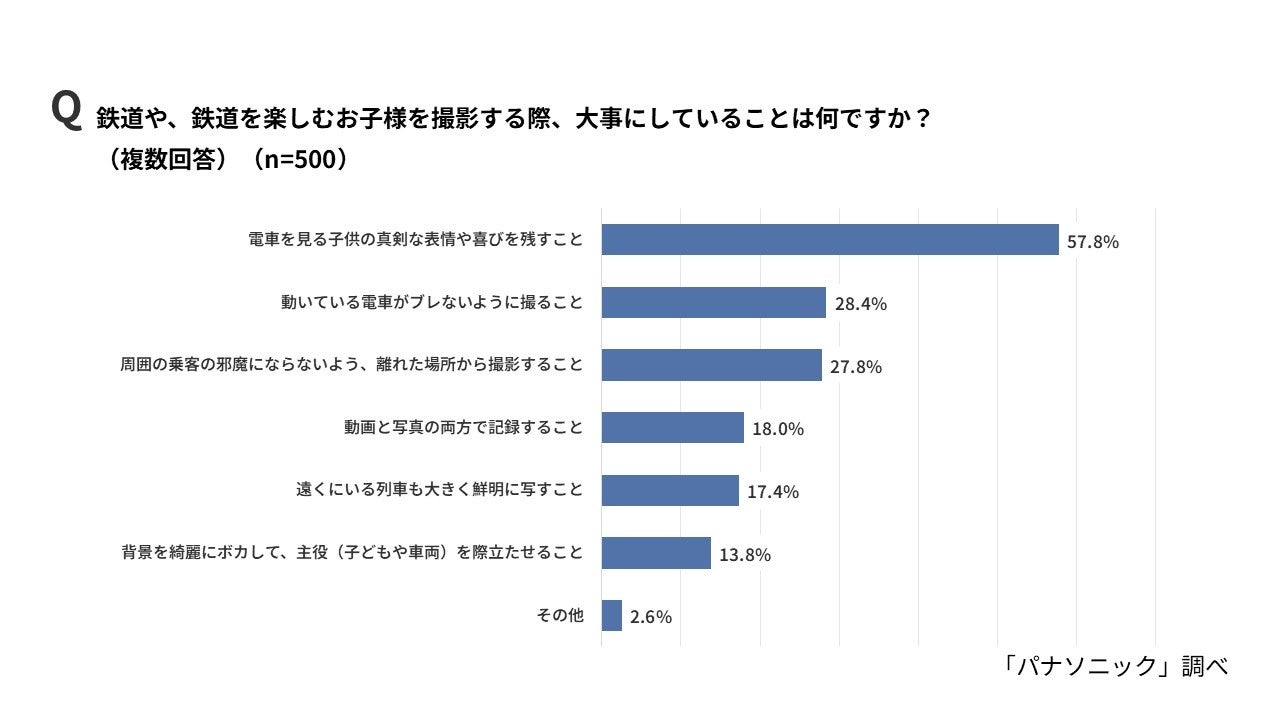 鉄道や、鉄道を楽しむ子どもを撮影する際、どのようなことを大事にしているかを聞いたところ、「電車を見る子どもの真剣な表情や喜びを残すこと」が57.8%で最多となりました。次いで「動いている電車がブレないように撮ること」が28.4%、「周囲の乗客の邪魔にならないよう、離れた場所から撮影すること」が27.8%と続く結果となりました。