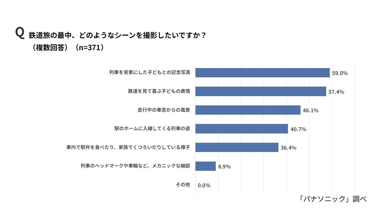 続いて、鉄道旅の中でどのようなシーンを撮影したいかを聞いたところ、「列車を背景にした子どもとの記念写真」が59.0%で最も多く、次いで「鉄道を見て喜ぶ子どもの表情」が57.4%、「走行中の車窓からの風景」が46.1%という結果になりました。単に車両そのものを撮るだけでなく、大好きな鉄道を前にした我が子の生き生きとした表情や、旅の情景をセットで残したいというニーズが高いようです。