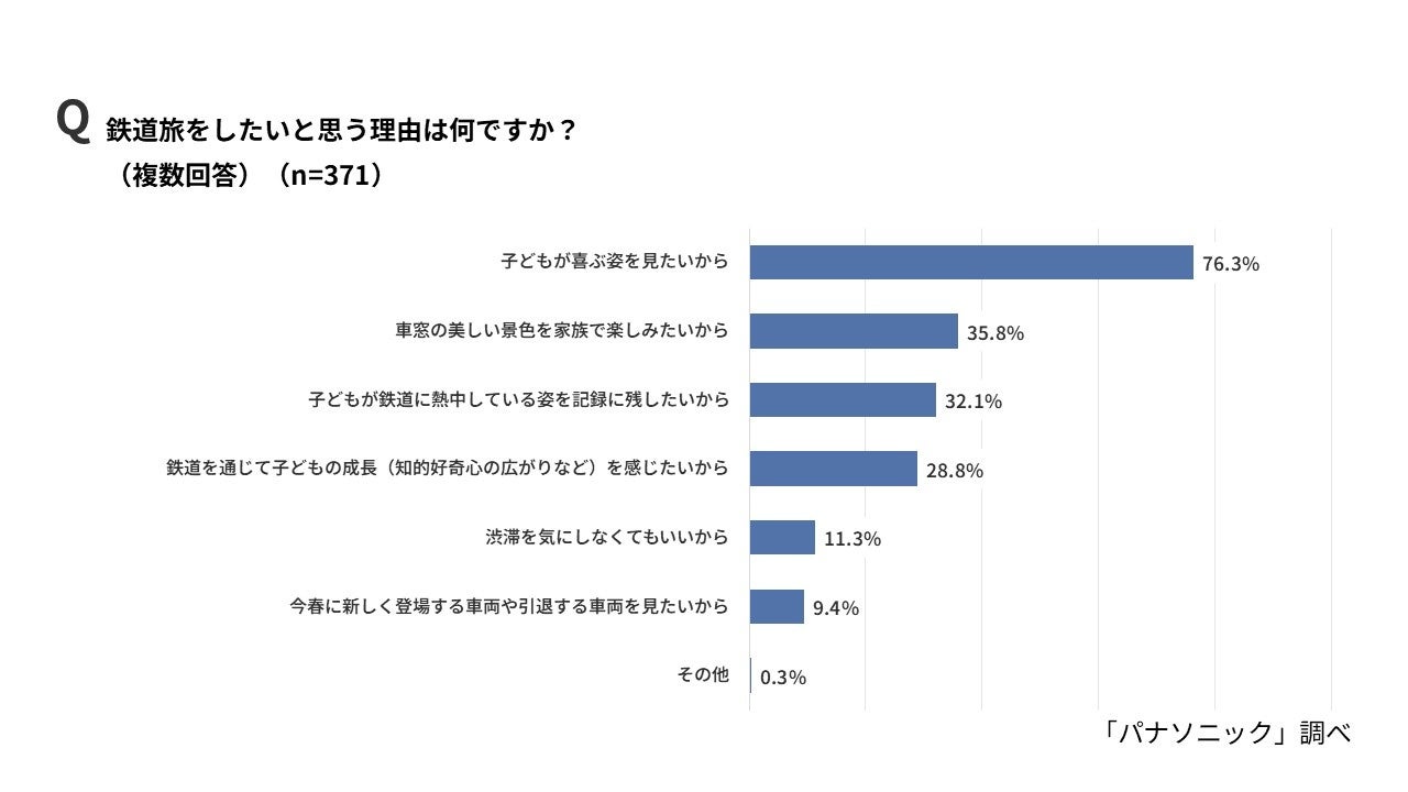 鉄道旅をしたい理由については、「子どもが喜ぶ姿を見たいから」が76.3%で最も多く、次いで「車窓の美しい景色を家族で楽しみたいから」が35.8%、「子どもが鉄道に熱中している姿を記録に残したいから」が32.1%と続きました。新型車両の登場や引退が話題となるこの春、鉄道を通じた特別な体験や、そこでしか見られない我が子の姿を形に残したいというニーズが高いようです。