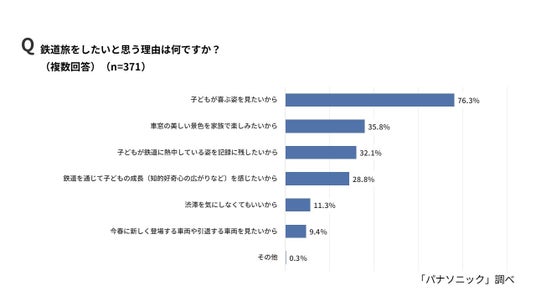 ■7割以上の親が今年の春、「鉄道旅や鉄道でのお出かけ」をしたい意向が明らかに。鉄道旅をしたい理由は「子どもが喜ぶ姿を見たいから」が最も多く、次いで「車窓の美しい景色を家族で楽しみたいから」、「子どもが鉄道に熱中している姿を記録に残したいから」と続く。