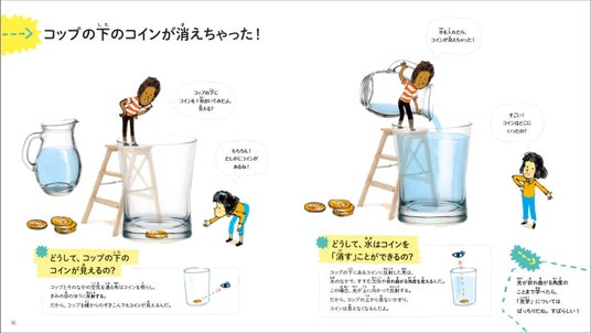 本シリーズ最大の魅力は、身近にあるものを使って、遊びながら科学の基礎を身につけられること。本書では、「グラスに顔をうつしてみよう」「コップのなかで台風をつくってみよう」「グラスをさかさにしても水がこぼれない!?」など、親子で遊びながら「光の反射の原理」や「円すい形のうずまきの原理」「大気圧」といった科学の現象に触れられます。