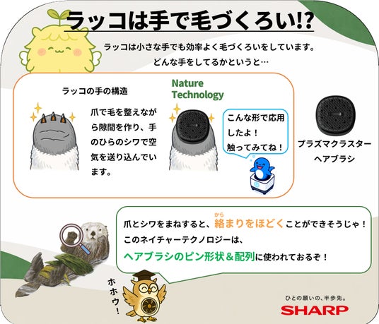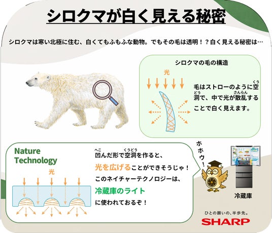 シャープは、生きものが持つ優れた性質や特徴を模倣するバイオミメティクス技術を「ネイチャーテクノロジー」と名付け、2008年より研究開発を進めてきました。 これまでイヌワシやアホウドリ、イルカ、シロクマなどの生き物から20種類以上のネイチャーテクノロジーを開発し、様々な家電製品に搭載してきました。快適さと環境配慮を両立した製品づくりを進めています。 本イベントでは、こうした技術の裏側にある「生きもののスゴイひみつ」を、子どもたちに分かりやすく紹介します。