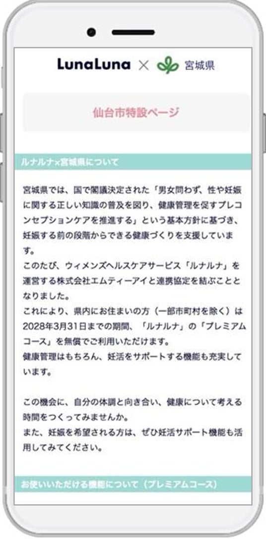 『ルナルナ』サービスを利用して、不妊治療や妊活に関する基礎知識の配信など、ライフステージに応じた女性の健康支援として知識啓発を実施する予定です。また今後は、宮城県が実施している各種助成制度についての情報発信も予定しています。