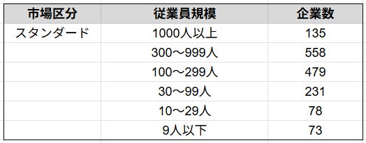 株式会社SalesNow(本社:東京都渋谷区、代表取締役:村岡功規、以下「当社」)は、国内540万社の企業情報を完全網羅した日本最大級のデータベース「SalesNow DB」より、スタンダード市場に上場する企業を従業員数別に分類し、その分布を集計しました。