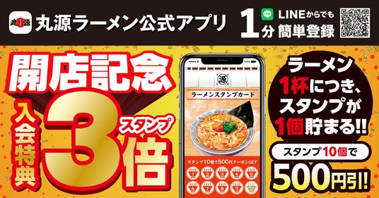 オープン記念として、2026年3月31日(火)まで、アプリ新規入会特典「スタンプ3倍キャンペーン」を開催いたします。期間内に『丸源ラーメン 戸塚上矢部店』でお食事された方が対象です。通常ラーメン1杯につきスタンプ1個たまるところ、キャンペーン期間中はラーメン1杯につきスタンプ3個たまります。この期間をお見逃しなく!