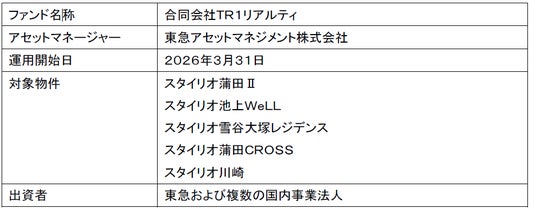 東急株式会社(以下、東急)および東急アセットマネジメント株式会社(以下、TAM)は、東急が東急線沿線を中心に展開する賃貸住宅ブランド「スタイリオ」シリーズの計5物件について、信託受益権化した上で、TAMが組成およびアセットマネジメント業務を受託する私募ファンド「合同会社TR1リアルティ」(以下、本ファンド)へ譲渡しました。本ファンドは、複数の国内事業法人を出資者として、2026年3月31日から運用を開始しています。