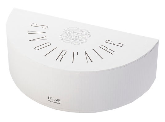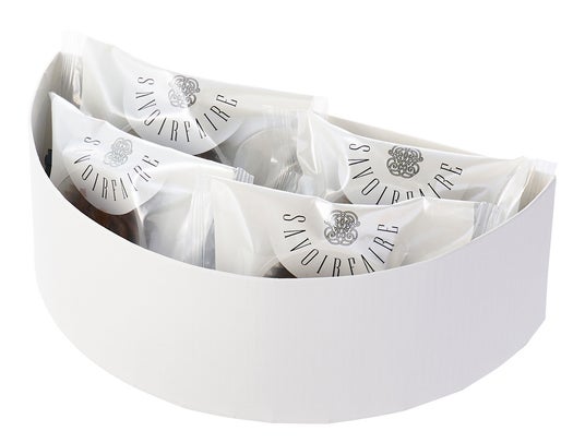 特長:プレステージブランド【サヴォアフェール】。メイン商品は、マロンの香りが際立つ、シャティーモンターニュ(焼きモンブラン)を詰め合わせた「エクレール4」。シャティーモンターニュは、芳醇なマロンペーストを使用し、口に入れた瞬間、濃厚で上品な香りが広がるモンブランをイメージした焼菓子です。パッケージは、白の珍しい半月形のBOXに、サヴォアフェールのブランドロゴだけをデザインし、シンプルに仕上げました。大切な方への贈り物など、フォーマルなシーンにも最適です。