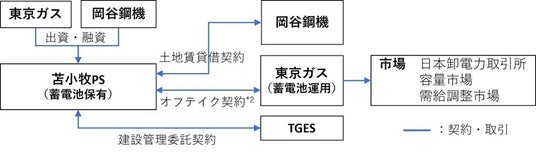 *2:供給者と購入者の間の、供給者が提供する予定の商品やサービスの全部または一部を購入または販売するための取り決め(経済産業省「GXスタートアップの創出・成長に向けたガイダンス【抜粋版】需要創出 ~LOIやオフテイク契約の締結~」より抜粋)。本件では東京ガスが20年間にわたり利用対価を苫小牧PSに対し支払い、系統用蓄電池の運用権を得る。