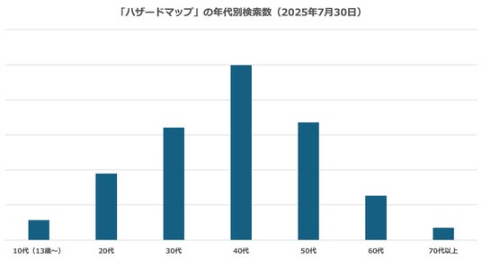 2025年7月30日にカムチャツカ半島沖地震が発生し、全国的に津波警報が発表されました。これを受けて「Yahoo!検索」で検索傾向を分析したところ、7月30日に「ハザードマップ」の検索数が前週平均の約15倍に、同31日には約3倍に増加、「地名 ハザードマップ」の検索数は7月30日に前週平均の約72倍、同31日には約7倍に増加し、防災情報への即時アクセスや地域別の情報の確認ニーズが高まったことがわかりました(※1)。また、年代別での7月30日の「ハザードマップ」の検索数は、40代が最も多く、次いで50代、30代と続きました(※2)。