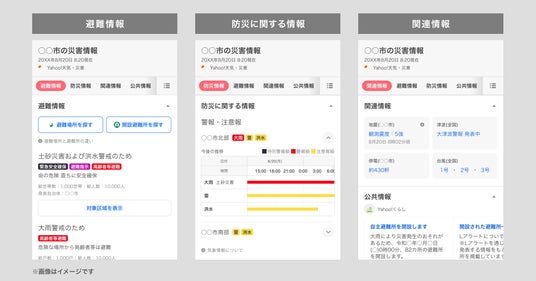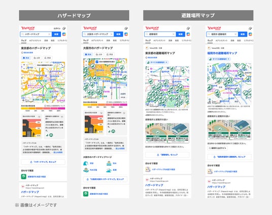 「Yahoo!検索」では、災害発生時に必要な情報をすばやく確認し、迅速に身を守る行動が取れるよう、避難情報や気象警報などの災害関連情報を市区町村別にまとめて検索結果上に掲出しています。