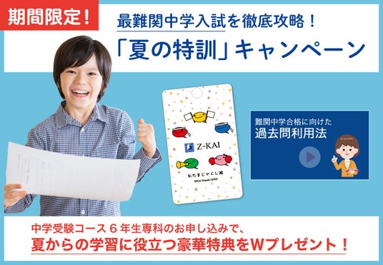株式会社増進会ホールディングス(Z会グループ)のグループ会社である株式会社Z会は、「Z会の通信教育」中学受験コース6年生において、7月4日(金)~8月31日(日)の期間内に対象講座をお申し込みいただいた方全員に、夏からの学習に役立つ特典をプレゼントする、「夏の特訓」キャンペーンを実施中です。