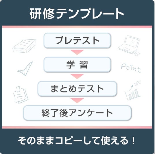 研修テンプレートの活用により、オリジナル教材の設定がスムーズに行えます。テンプレートをコピーして学習項目を書き換え、事前にアップロードした動画や資料のコンテンツを割り当てるだけでコース登録が完了します。