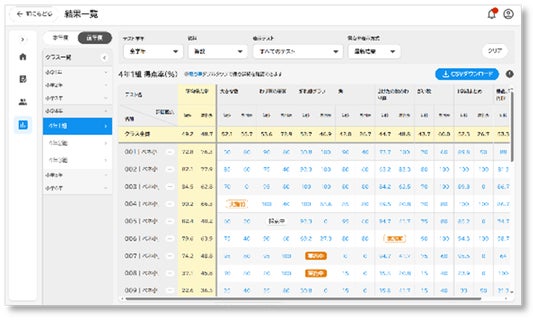 実施したテストの結果は教科ごとに一覧で表示。観点別の得点率や子どもの受験状況も一目で分かり、成績処理の手間が効率化できます。