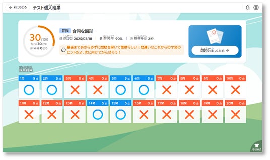 児童生徒側では、取り組んだテストがアプリにより即時採点されて結果が表示されます。