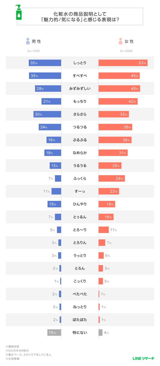 スキンケアをしている人に、化粧水の商品説明として「魅力的/気になる」と感じる表現について聞きました(2025年8月時点)。