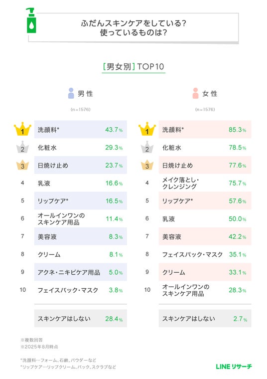 「洗顔料」「化粧水」「日焼け止め」が上位。女性は「メイク落とし・クレンジング」の割合も高め