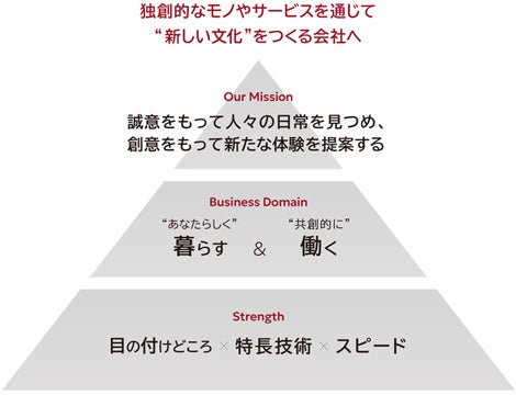 当社は、本スローガンのもと、人々の「暮らす」と「働く」において、独創的なモノやサービスを次々と生み出すだけでなく、それらを通じて“新たな文化”を創造する企業を目指してまいります。