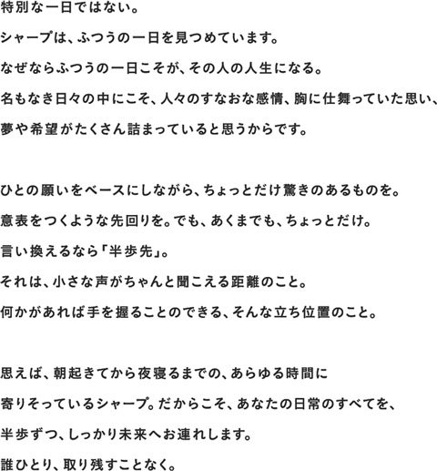 このたび制定したコーポレートスローガン「ひとの願いの、半歩先。」は、その当社が目指す方向性に基づき、すべてのステークホルダーにお届けする「シャープならではの価値」を言葉として表現したものです。