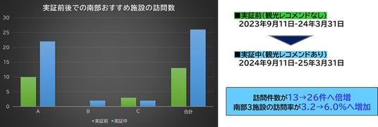 1.南部観光レコメンド:観光レコメンド実証前後での、おすすめ施設の訪問数を比較検証