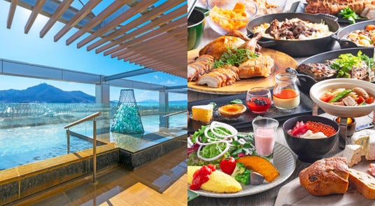 街並みを眺めながら浸かる最上階の大浴場や150種類を超える品数の朝食など、非日常を堪能。