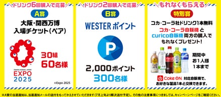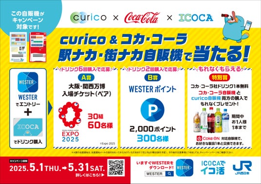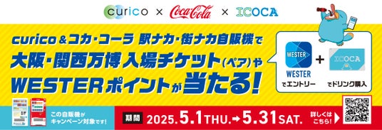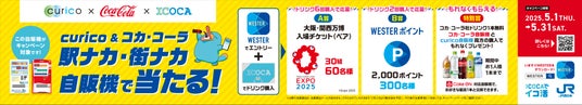 株式会社ジェイアール西日本デイリーサービスネット(本社:兵庫県尼崎市、代表取締役社長:中西豊)、コカ・コーラ ボトラーズジャパン株式会社(本社:東京都港区、代表取締役社長 最高経営責任者:カリン・ドラガン)、および西日本旅客鉄道株式会社(本社:大阪市北区、代表取締役社長:長谷川一明)は、2025年5月1日(木)~5月31日(土)の間、対象となる駅ナカ飲料自動販売機curicoまたはコカ・コーラ社自動販売機にてICOCAでドリンクを購入しスタンプをためて応募すると、抽選で「大阪・関西万博入場チケット(ペア)」や「WESTERポイント2,000ポイント」が当たるキャンペーンを実施いたします。また、期間中に対象の駅ナカ飲料自動販売機curicoとコカ・コーラ社自動販売機の両方でICOCAにてドリンクを購入すると、「Coke ON(R)」のドリンクチケット1枚をプレゼントします。