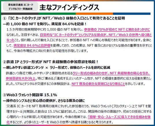 本施策では、NFTやブロックチェーン技術が実際の移動体験や日常行動と結びつくことで、生活者へのWeb3技術の浸透や社会実装に向けた現実的な足がかりとなる可能性が示されました。特に、鉄道IPと交通系ICカードを活用したデジタルラリーにおいては「交通系ICカードのタッチ」という日常的で直感的な行為が、NFTやWeb3との最初の接点、“カギ”として機能し、これまで参加のハードルが高かったブロックチェーン技術への導入を促す糸口となったことが確認されました。日常行動を入口とする設計は、NFTおよびブロックチェーンの社会実装を進めるうえで、重要な示唆を与えるものといえます。