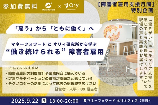 株式会社マネーフォワードは、株式会社オリィ研究所と共同で、「実践から学ぶ “働き続けられる”障害者雇用」をテーマにしたイベントを、2025年9月22日(月)にマネーフォワード本社オフィスにて開催します。