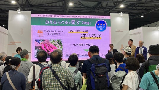 当日は、ワタミファームの生産担当者が講演ブースに登壇し、有機栽培の工夫や温室効果ガス(GHG)削減に向けた現場での取り組みについてご紹介させていただきました。また、会場では三つ星評価を取得した有機野菜を使用した「キャロット&オレンジジュース」や「干し芋」も来場者の皆さまにご提供し、多くの方々よりご好評をいただきました。