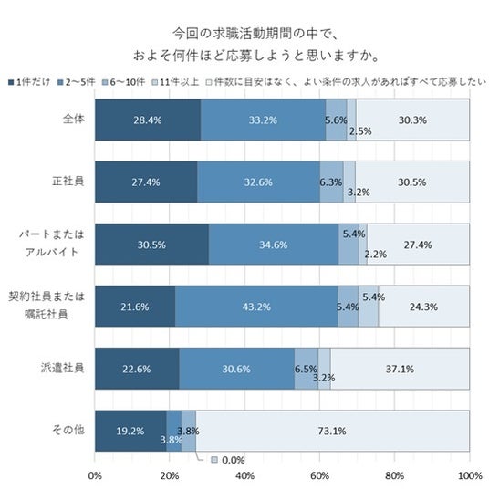 「2~5件」33.2%、「件数に目安はなく、よい条件があればすべて応募したい」30.3%、「1件だけ」28.4%