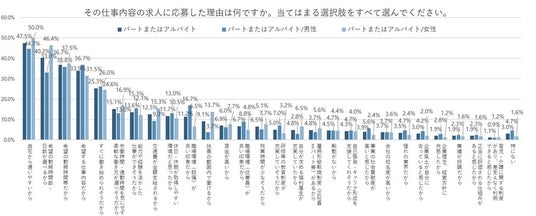 求人に応募した、パートまたはアルバイト雇用を希望する人に、自身が応募した求人を選んだ理由をきいた(複数回答)。最も多かったのは「自宅から通いやすいから」で47.5%、次いで「希望の勤務時間数・日数が選べるから」が40.2%、「希望の勤務時間帯だから」が36.7%となった。限られた時間の中で就労をしたいことから、通いやすさも同時に意識していることがわかる。