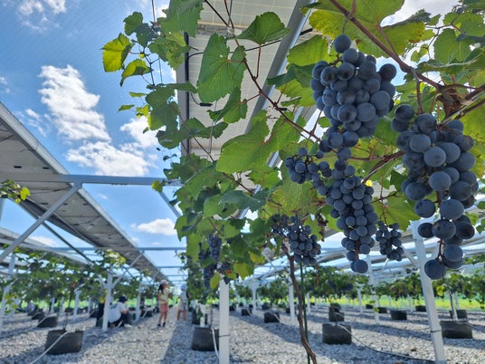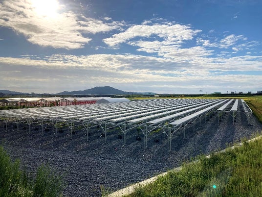 さらに独自の取り組みとして、太陽光を農地(ぶどう畑)とその上部空間を活用した太陽光発電で共有する「ソーラーシェアリング」を行っております。これにより発電された再生可能エネルギーを園内で消費するだけでなく、ソーラーパネル自体がぶどうの生育を阻害する雨を防ぐ雨除けとして、ぶどうの生育環境を整える役割を果たしています。