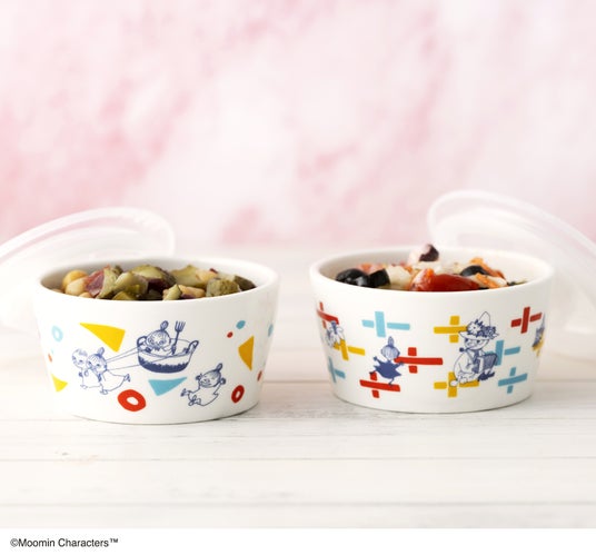 ムーミンの磁器の密閉保存容器が2個セットになって初登場!高級感のある磁器製の容器です。電子レンジや食器洗浄乾燥機にも使えて、手にとるとずっしり重みもあります。 ひとつめにはムーミン、リトルミイ、スナフキン、ニョロニョロがデザインされ、もうひとつの器にはリトルミイとそのきょうだいたちが遊び回っている様子が描かれています。どちらの側面にも北欧アートが施されており、眺めているだけでもほんわか癒やされます。 密閉性の高いフタがついているため、ラップ不要でレンチン&冷蔵保存できるだけでなく、汁気のあるものにも使えます。