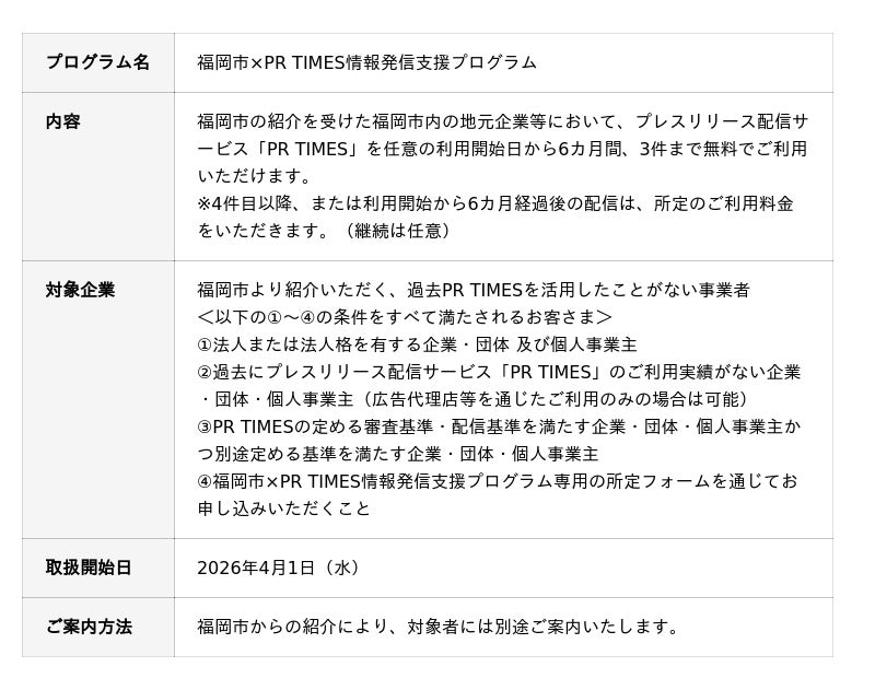 - 福岡市が支援する事業者・団体に「PR TIMES」を無償で活用できるプログラムを提供