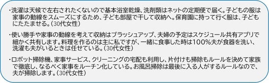 家事の時短や負担軽減の実現には、家族での家事シェアだけでなく、便利な家事家電の導入、すすぎが1回で済む洗剤やこすらず汚れが落とせる洗剤などの利用、消耗品をネット定期便の購入に切り替える、外部サービスの利用など様々な方法があります。また、家族がスムーズに家事に関わるためには、家事のやり方、道具や洗剤の収納方法なども含めてルールを設定したり、家事の動線などを見直して、ストレスなくできる仕組みを作ることも大切のようです。