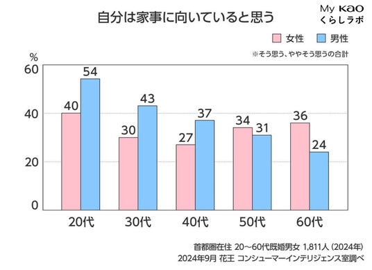 男性の家事への向き合い方も、大きく変わってきています。男性の家事への関与が増えるなか、「自分は家事に向いている」と感じる男性はこの10年で増加し、特に20~40代では男性が女性を上回るようになりました。また、「家事には自分なりのやり方やこだわりがある」、「家事をすることで家族に喜ばれたい」と感じる男性も増えています。家事を好き・楽しいと感じる意識も広がっており、「洗濯物を洗う」(女性31%、男性18%)、「洗濯物を干す」(32%、19%)では、女性の方が高いものの、「食事の後片付け」(9%、21%)や、「ごみ出し」(7%、22%)、「部屋の掃除」(15%、25%)などでは、男性が女性を上回っており、この傾向は若い世代を中心に幅広い年代で見られます。