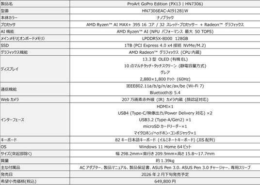 ※今回発表のASUS ProArt PX13 HN7306EAの詳細スペックはこちらからご確認ください。