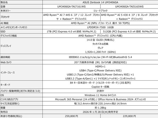 ※今回発表のASUS Zenbook 14 UM3406GAの詳細スペックはこちらからご確認ください。