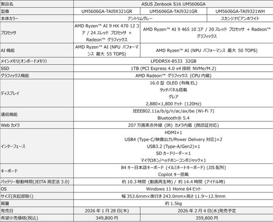※今回発表のASUS Zenbook S16 UM5606GAの詳細スペックはこちらからご確認ください。