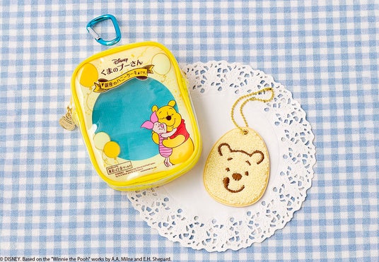 3つめは、4個入ボックスやお菓子とおそろいが可愛い『クリアポーチ』!スポンジケーキみたいなふわふわサガラ刺繍のストラップ付きです。カラビナもついているので、お気に入りのカバンにつけてどこにでも連れて行きたくなりそう。「プーさん」と一緒にお出かけを楽しんでくださいね。