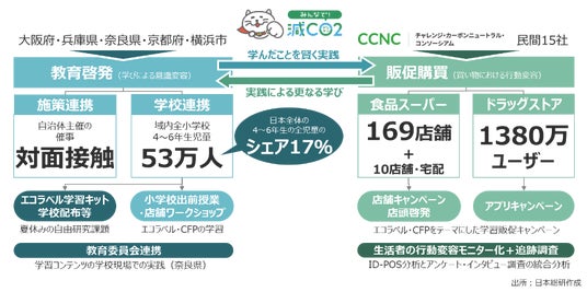 本プロジェクトを主催する株式会社日本総合研究所と2府2県1政令指定都市(大阪府/兵庫県/奈良県/京都府/横浜市)との連携協定等に基づき、同自治体の全小学校等に通う4~6年生約53万人と、その保護者を中心とした生活者に対して、「教育啓発」と「販促購買」に一気通貫で取り組むことで脱炭素行動変容を促します。
