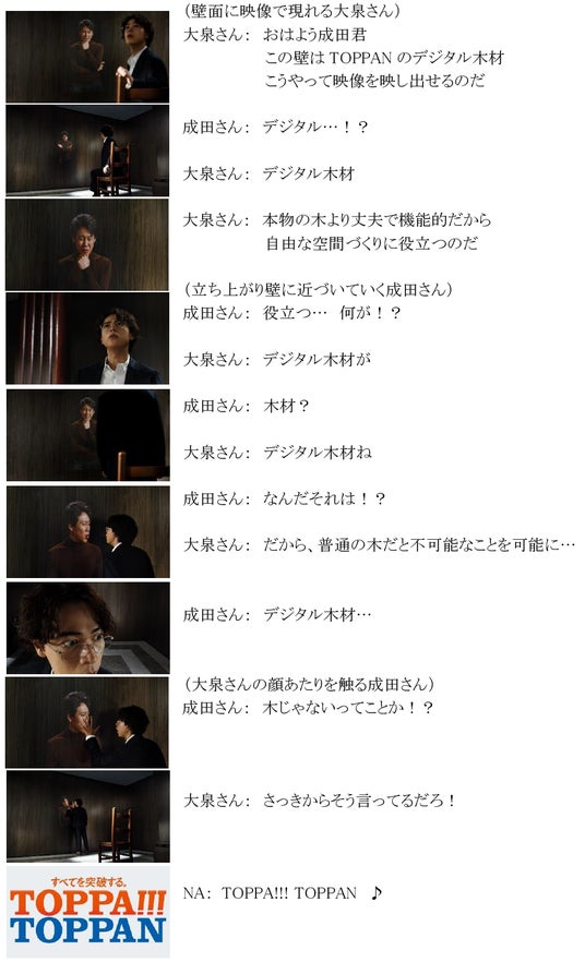 TOPPANホールディングス株式会社(本社:東京都文京区、代表取締役社長 CEO:麿 秀晴、以下 TOPPANホールディングス)は、大泉洋さんと成田凌さんが出演するCMシリーズ最新作『すべてを突破する。TOPPPA!!!TOPPAN デジタル木材(空間演出)篇』を2025年8月8日(金)より公開します。