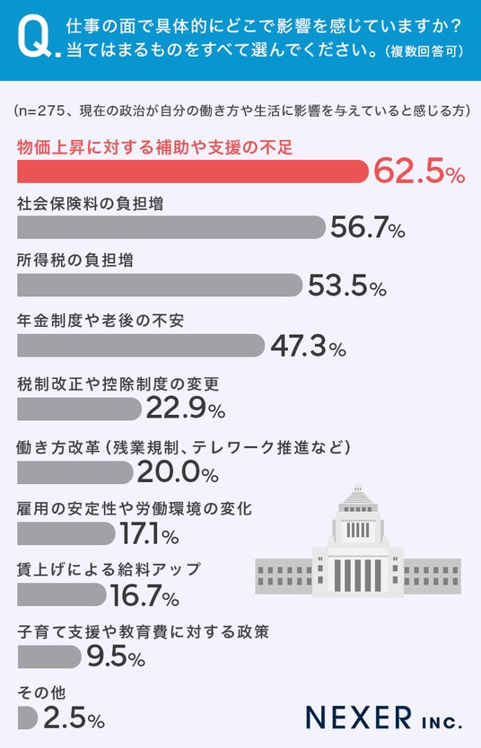 もっとも多かったのは「物価上昇に対する補助や支援の不足」で、62.5%の方が回答しています。