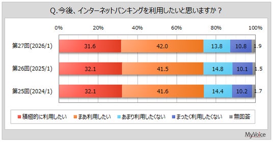 マイボイスコム株式会社(東京都千代田区、代表取締役社長:高井和久)は、27回目となる『インターネットバンキングの利用』に関するインターネット調査を2026年1月1日~7日に実施しました。