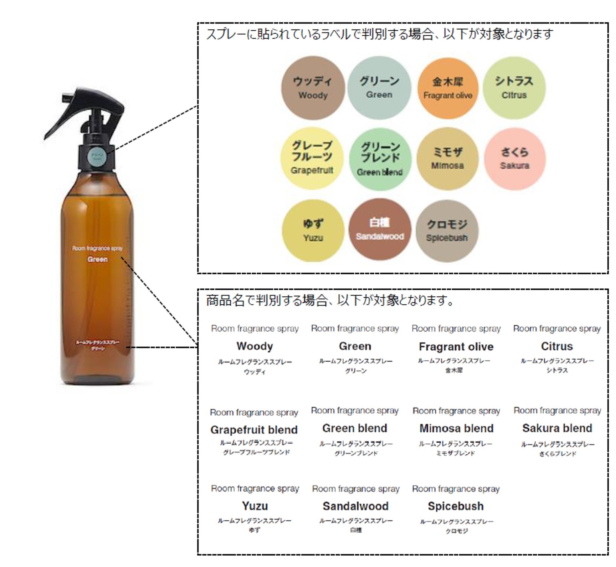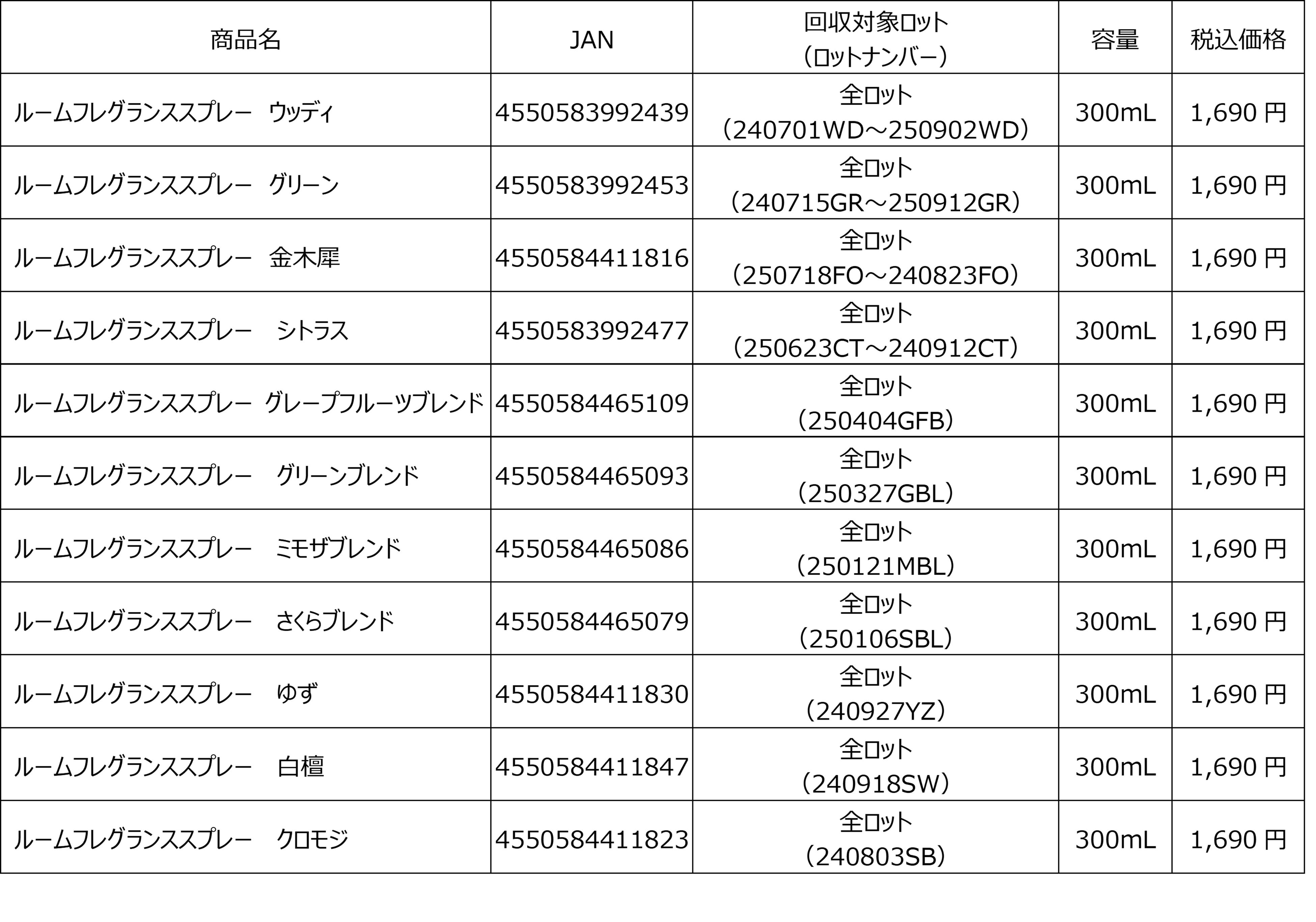 以下の「ルームフレグランススプレー」に関しては、製造工場が異なる上、問題ないことが確認できておりますので、引き続きご使用いただけます。