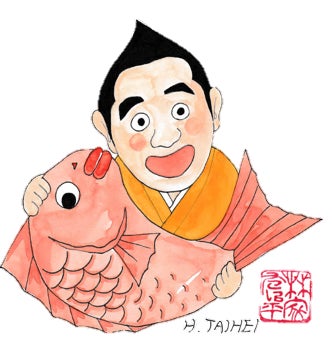 オレンジ色の着物を着た たい平さんが、大きな鯛を持っているイラストです。