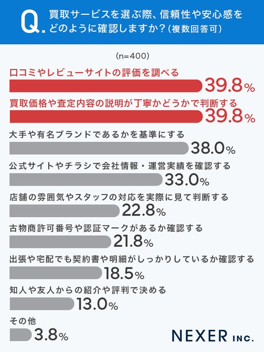 また、買取サービスを選ぶ際、信頼性や安心感をどのように確認するのかは「口コミやレビューサイトの評価を調べる」が一番多く選ばれました。