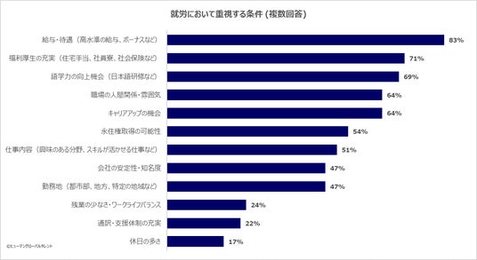 日本での就労において重視する条件は、「給与・待遇」(83%)、「福利厚生の充実」(71%)が上位に挙がりました。これに加え、「語学力の向上機会」(69%)「職場の人間関係・雰囲気」(64%)「キャリアアップの機会」(64%)も多数で、経済的な側面だけでなく、自己成長と良好な職場環境への関心が高いことが伺えます。
